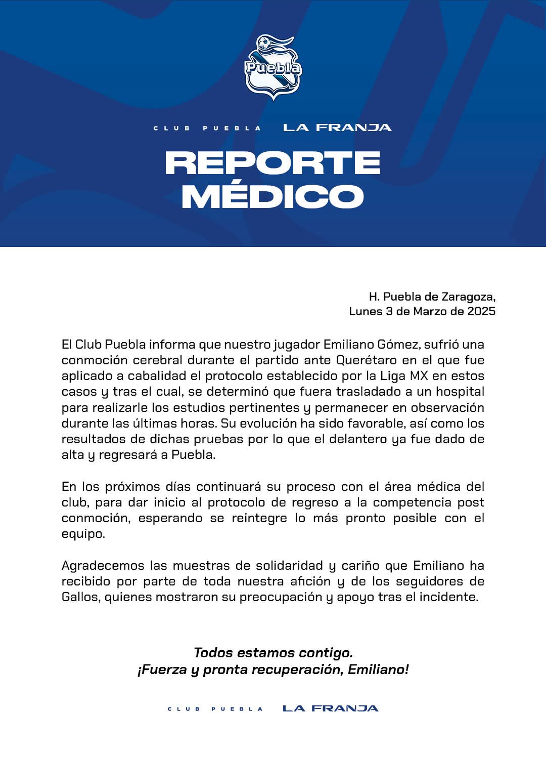 Por su parte, la institución de la Angelópolis envió un parte médico donde señala que en próximos días continuará su proceso con el área médica del club para dar inicio al protocolo de regreso a competencia post conmoción.