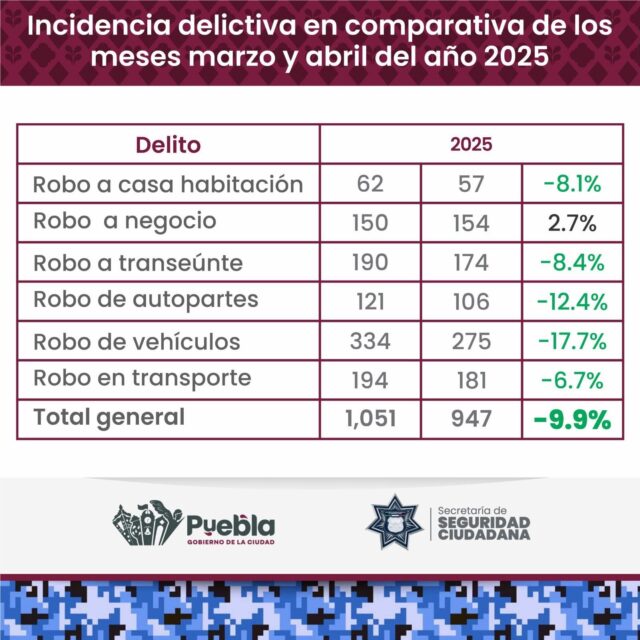 Los delitos que disminuyeron en Puebla capital son robo a casa habitación un 8.1 %, robo a transeúnte un 8.4 %, y robo de autopartes un 12.4 % siendo el crimen con menos incidencia.