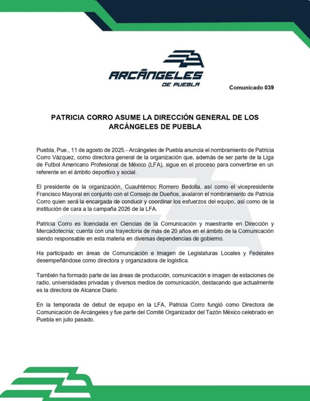 Patricia Corro Vázquez fue anunciada como la nueva Directora General de los Arcángeles de Puebla, equipo de la Liga de Fútbol Americano Profesional (LFA). El nombramiento se dio a conocer a través de un comunicado oficial publicado en las redes sociales del club, con el respaldo del presidente Cuauhtémoc Romero Bedolla y el Consejo de Dueños.