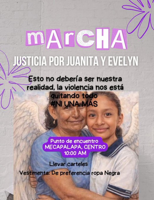 El llamado es a vestir de negro y portar consignas para exigir justicia por Juana y Evelyn, así como garantías de seguridad para mujeres y niñas en la región. La protesta recorrerá calles principales de la comunidad y culminará en el zócalo local.
