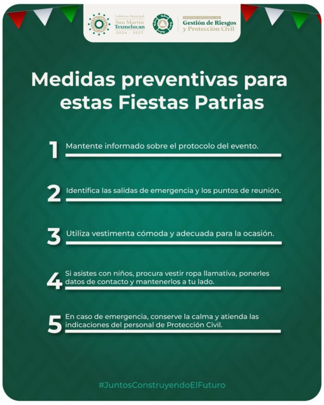 Con el objetivo de garantizar un ambiente de paz, orden y seguridad durante los festejos por el 215 aniversario del inicio del movimiento de Independencia de México, el Gobierno Municipal de San Martín Texmelucan que preside Juan Manuel Alonso Ramírez, emite las siguientes medidas preventivas y recomendaciones para los asistentes a eventos masivos.
