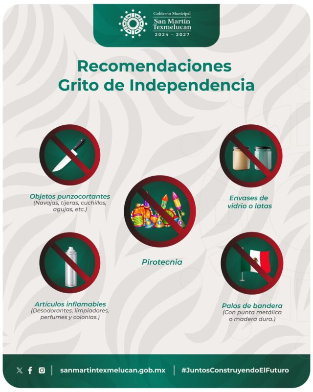 Con el objetivo de garantizar un ambiente de paz, orden y seguridad durante los festejos por el 215 aniversario del inicio del movimiento de Independencia de México, el Gobierno Municipal de San Martín Texmelucan que preside Juan Manuel Alonso Ramírez, emite las siguientes medidas preventivas y recomendaciones para los asistentes a eventos masivos.