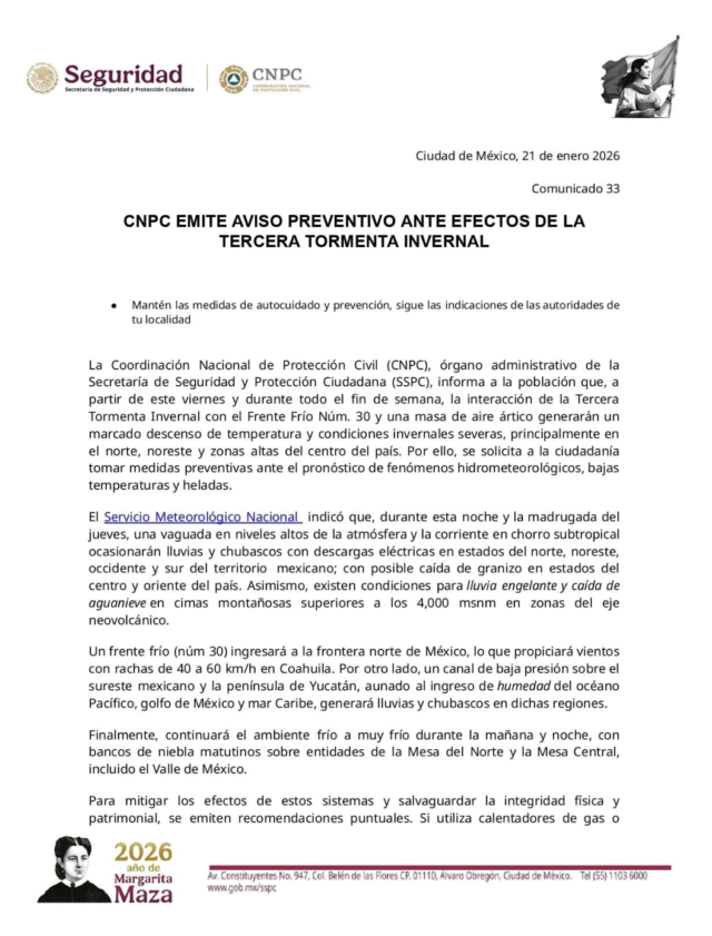 El sistema está acompañado por una masa de aire ártico, lo que favorece condiciones invernales severas, con heladas, vientos intensos, lluvias, bancos de niebla y posible caída de nieve o aguanieve en zonas específicas del país. Las autoridades advierten que estos efectos se mantendrán durante los próximos días, principalmente en el norte, noreste y regiones altas del centro de México.