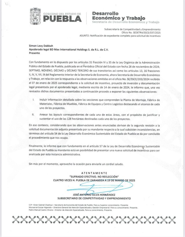 En las observaciones que le hicieron a su proyecto en Puebla, que son muchas, le objetan la carencia de superficies, ubicaciones, cálculo de los empleos directos e indirectos que generará el proyecto, entre otros.