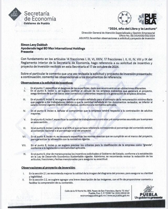 En dichos documentos la anterior Secretaría de Economía bajo la administración de Sergio Salomón Céspedes Peregrina, y la actual Secretaría de Desarrollo Económico y Trabajo bajo la administración del gobernador, Alejandro Armenta, emitió las observaciones correspondientes a una solicitud de proyecto que ingresó como apoderado legal de la firma BD Max International Holdings.