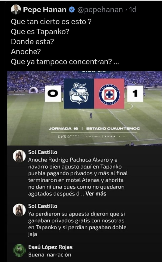 Mire usted, resulta que durante la transmisión por internet generada por el mismo club en el partido donde la Franja cayó al son de tres goles a cero frente a la Máquina de Cruz Azul, dirigida por el ex-DT de la Franja, Nicolás Larcamón, se hizo una denuncia pública por parte de una escort (como ahora les llaman), donde mencionó que tres jóvenes jugadores de Puebla, que estaban jugando como titulares, pasaron la noche anterior en un antro, donde pagaron bailes (privados, les llaman) y apostaron con las chicas que, en caso de ganar, les tendrían que dar bailes gratis o, en su defecto, si perdían, ellos los pagarían al doble (sobra decir quién perdió la apuesta). Y lo peor es que denunciaba que estaban jugando mal debido a que los habían dejado muy cansados.