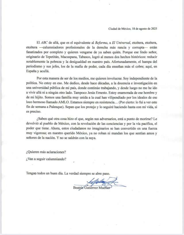 Beatriz Gutiérrez Müller negó categóricamente los rumores que la señalaban de haberse mudado a España junto a su hijo Jesús Ernesto. A través de un comunicado publicado en X, antes Twitter, la escritora y académica aclaró que continúa viviendo en México, donde se desempeña como docente e investigadora en una universidad pública, y advirtió que analiza emprender acciones legales contra quienes difundieron lo que calificó como “noticias falsas”.