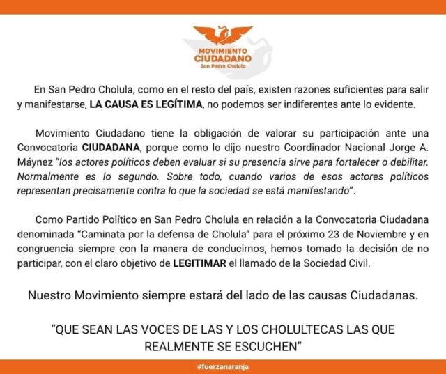 San Pedro Cholula, Pue.,– Movimiento Ciudadano en San Pedro Cholula informó que no participará en la “Caminata por la Defensa de Cholula”, convocada por ciudadanos para el próximo 23 de noviembre.