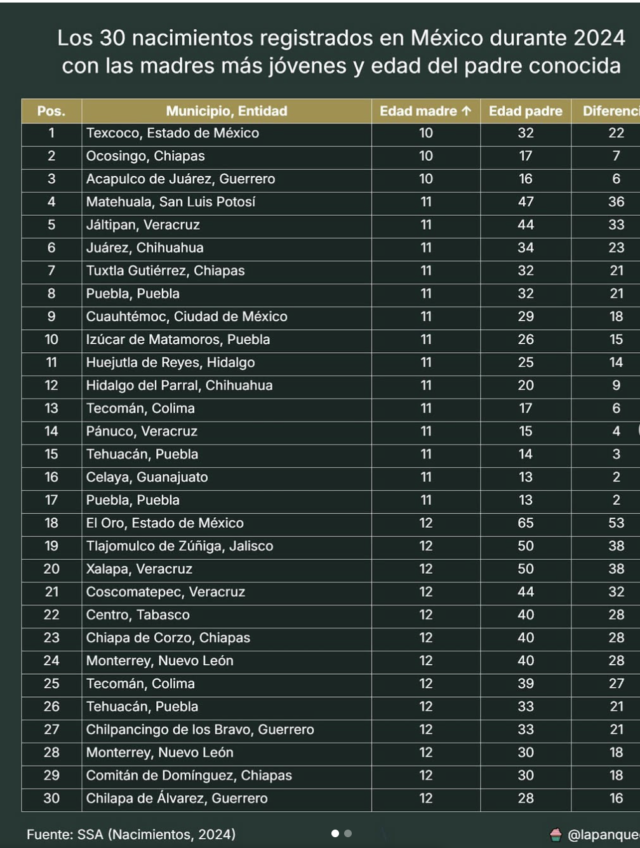 Los datos marcan que en Puebla, tanto la madre como el padre eran adolescentes, con edades de 11 y 13 años respectivamente. Esta información, aunque menos común que otros casos en el país, refleja una realidad preocupante.