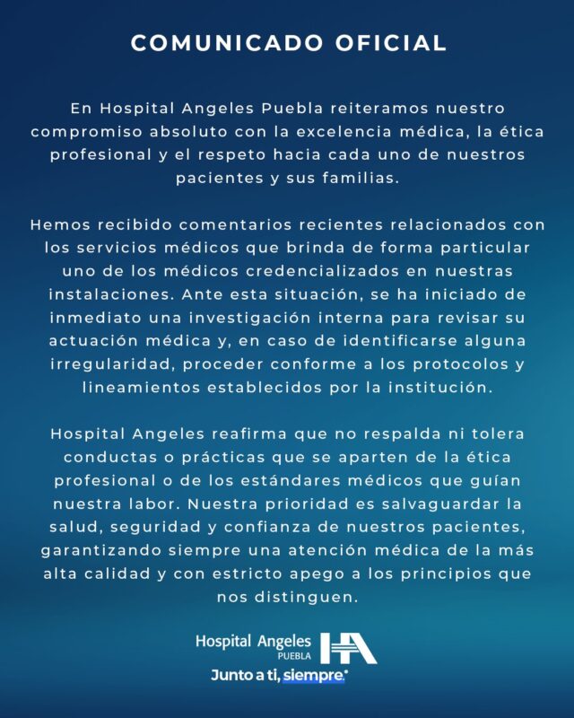 Ante la creciente presión pública, el Hospital Ángeles Puebla emitió un comunicado oficial, en el que reconoce haber recibido comentarios recientes relacionados con los servicios brindados por uno de sus médicos credencializados. En respuesta, informó que ha iniciado una investigación interna inmediata para revisar la actuación del especialista. El hospital señaló que, de encontrarse alguna irregularidad, procederá conforme a los protocolos y lineamientos establecidos por la institución.