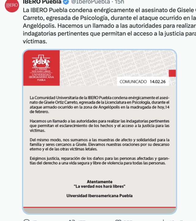 En un comunicado oficial, la IBERO Puebla condenó enérgicamente el asesinato de Gisele Ortiz Carreto, egresada de la Licenciatura en Psicología, quien perdió la vida durante la agresión. La institución subrayó que los hechos constituyen un acto que lastima profundamente a su comunidad universitaria.
