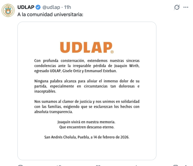 Por su parte, la UDLAP manifestó consternación por la muerte de uno de sus egresados y se sumó a la exigencia de esclarecimiento total de los hechos. En su comunicado, la institución expresó: