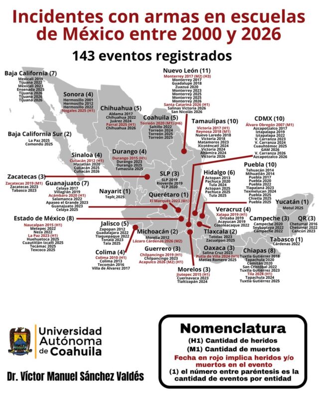 A nivel nacional, el registro elaborado por el investigador contabiliza 143 incidentes con armas de fuego en escuelas en México desde el año 2000, distribuidos en prácticamente todas las entidades federativas del país.