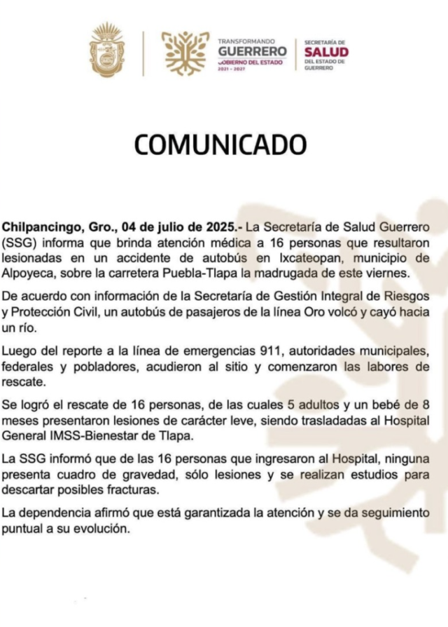 De acuerdo con autoridades de Protección Civil de Guerrero, los primeros reportes hablaban de tres personas sin vida, sin embargo, con el paso de las horas se confirmó que el número de víctimas fatales ascendió a siete. Además, al menos 16 pasajeros resultaron lesionados, quienes fueron trasladados de emergencia al Hospital General IMSS-Bienestar de Tlapa. Varios más fueron atendidos por crisis nerviosa en el lugar de los hechos.
