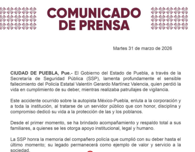 El gobierno del estado a través de la Secretaría de Seguridad Pública confirma que un elemento de la Policía Estatal perdió la vida la madrugada de este martes tras perder el control y estrellarse en un pilar de la autopista México-Puebla, hecho que generó un incendio dejando la patrulla completamente calcinada.